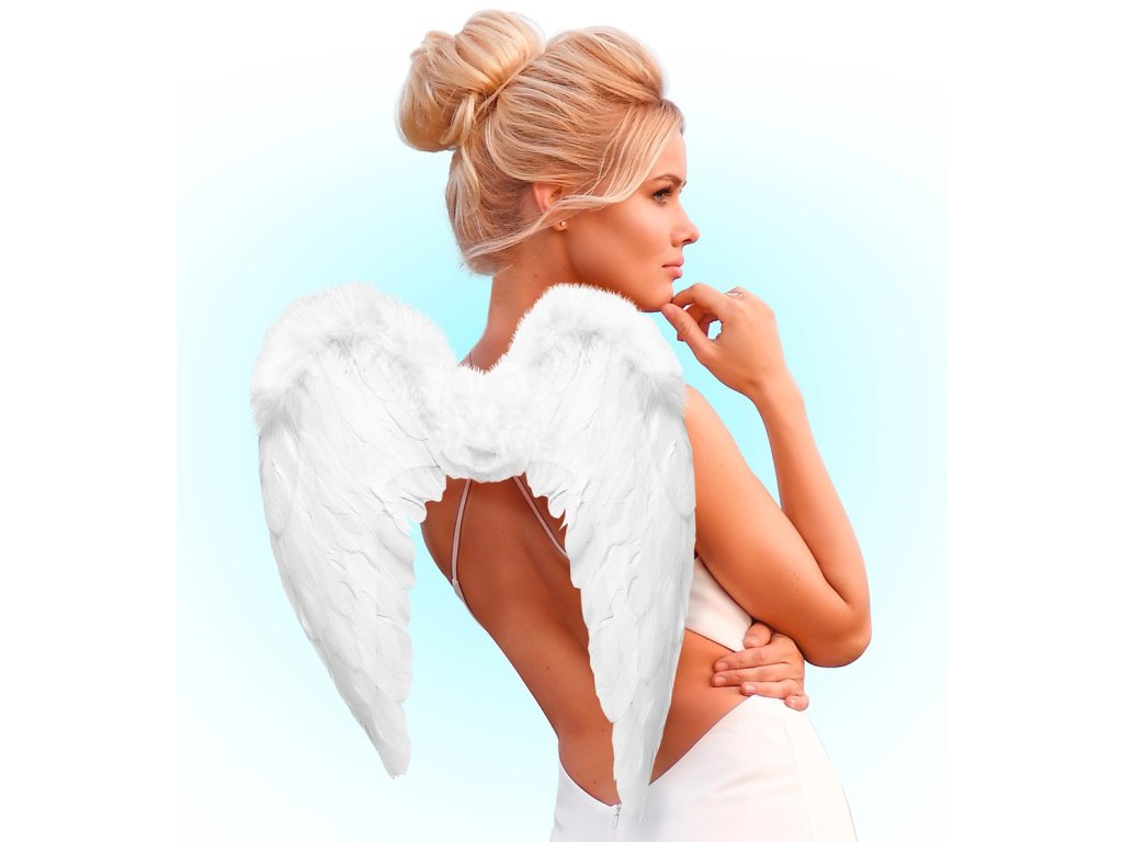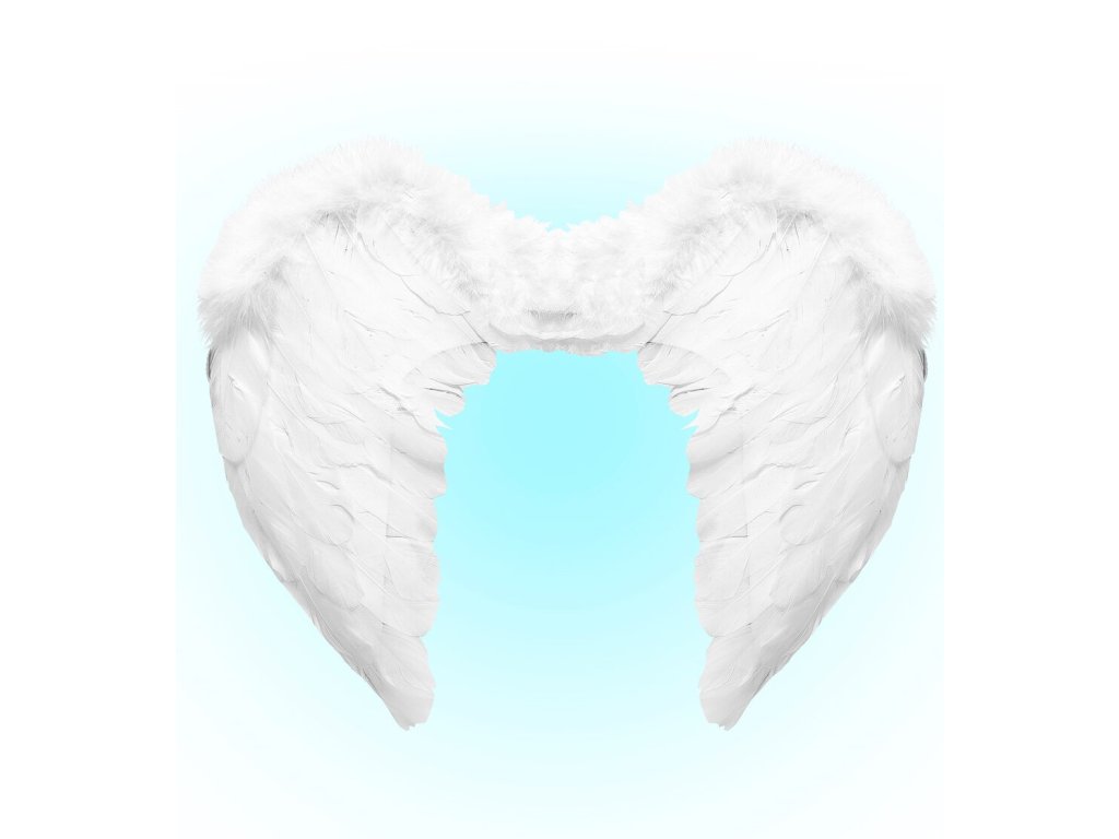 Andělská křídla z prachového peří. Křídla jsou spojena dohromady a nasazují se na ramena pomocí dvou gumiček, kterými prostrčíte ruce. Využijete je ke kostýmu anděla, ke kterému křídla neodmyslitelně patří.