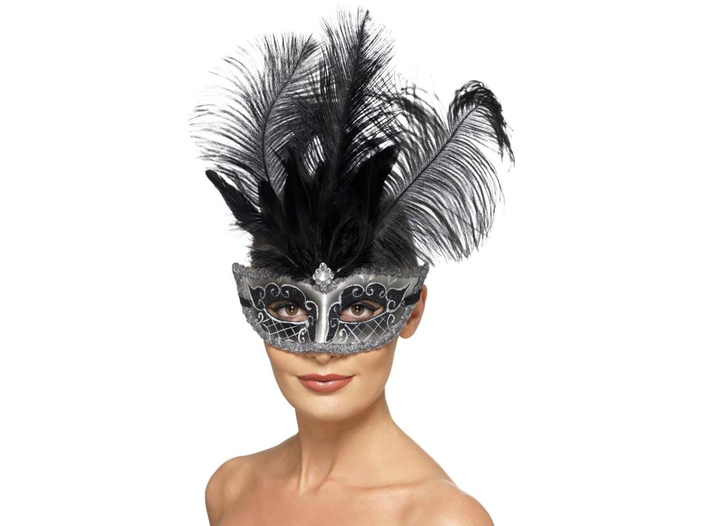 Luxusní benátská maska zdobená stříbrným lemováním a bohatým pštrosím peřím využijete na jakýkoliv ples v tomto stylu.