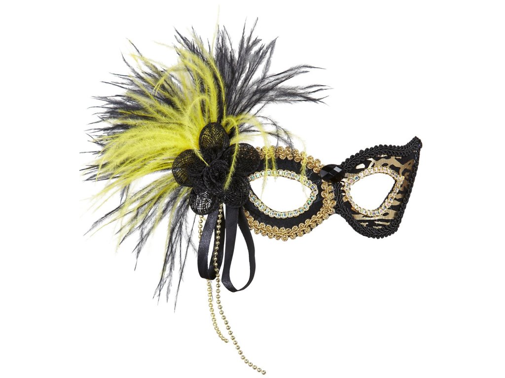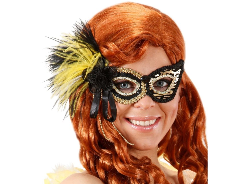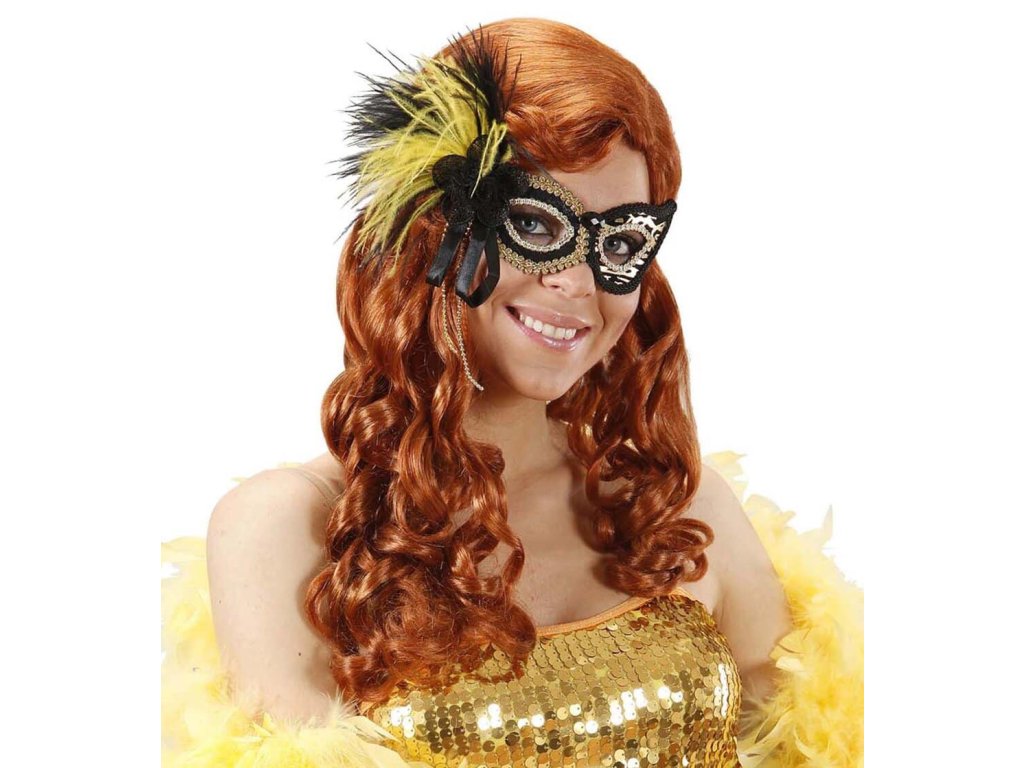 Elegantní škraboška s peřím a zlatavým tygřím vzorem. Maska je pěkně zpracovaná a potažená látkou z obou stran. Maska pochází z dílny italského výrobce Widmann.