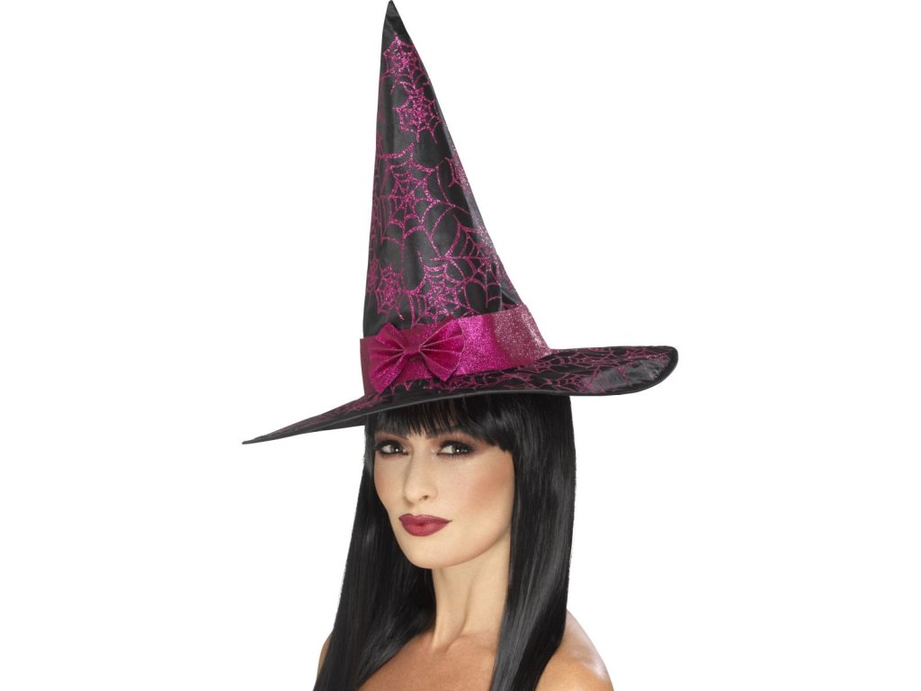 Černý čarodějnický klobouk je ozdobený růžovými třpytivými pavučinami a mašličkou, která mu dodává elegantní nádech. Klobouk je určený pro dámy, které nechtějí mít obyčejný černý kostým a zároveň chtějí dát najevo, že ne všechny čarodějnice musí být zlé a hrůzostrašné. Čarodějnický klobouk je vhodný doplněk na Halloween, slet čarodějnic, karnevalové plesy, čarodějnické večírky a podobné tematické akce.
