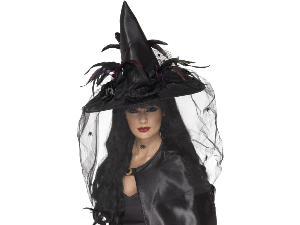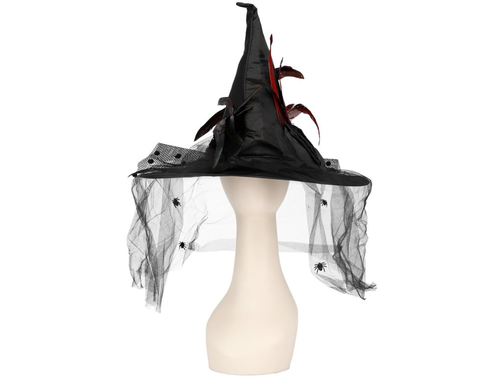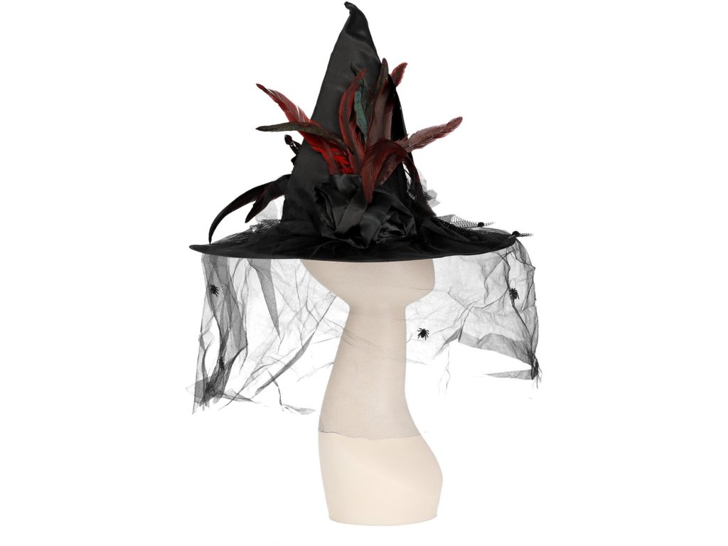 • klobouk zdobí ptačí peří a černý závoj s pavouky