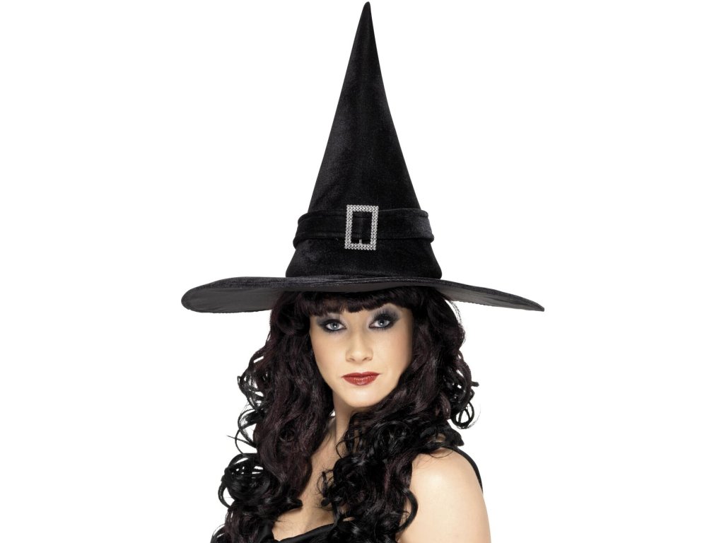 Stejně tak jako k čarodějnici patří létající koště a kocour na rameni, nosí každá čarodějnice špičatý klobouk. Efektivní doplněk vynosíte na kostýmové party, Halloween, pálení čarodějnic a jiné tematické akce. Černý klobouk je zdobený stříbrnou sponou.