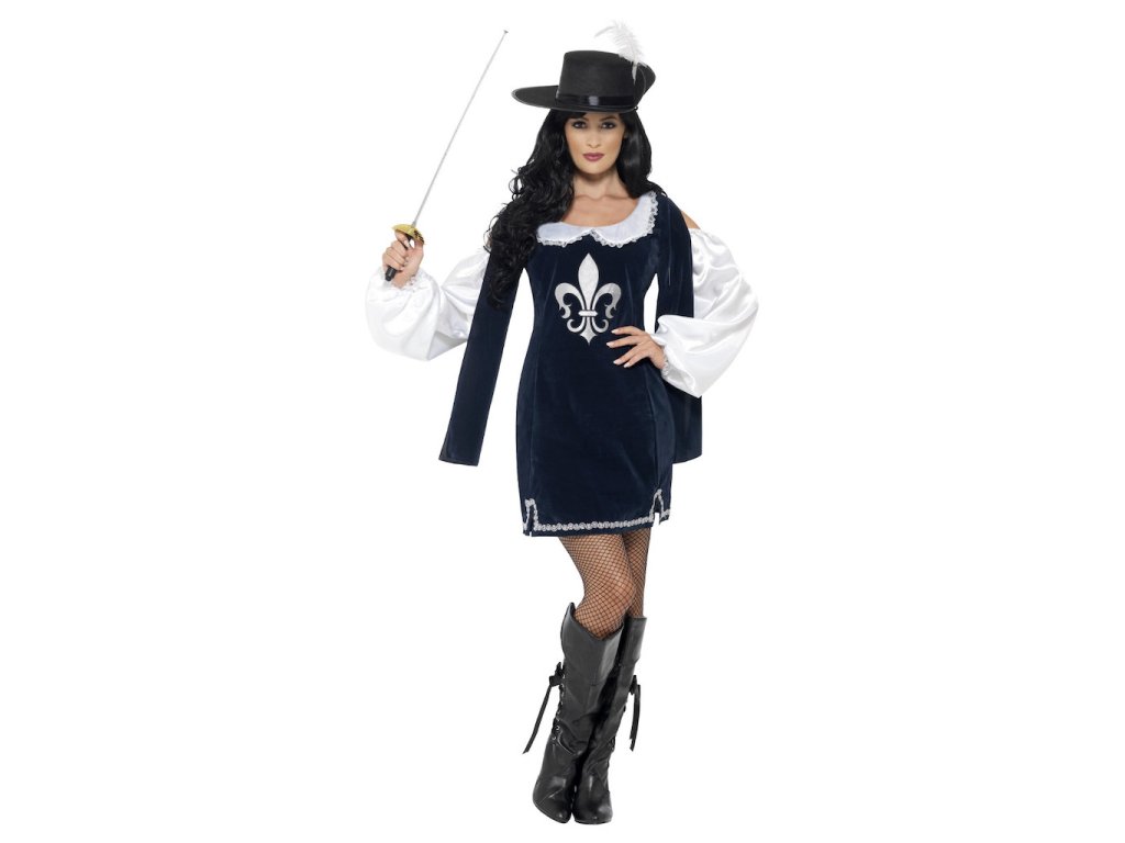 Tento elegantní kostým v tmavě modré barvě, který obsahuje šaty a stylový klobouk, vám dodá šarm a sebevědomí opravdové mušketýrky.
