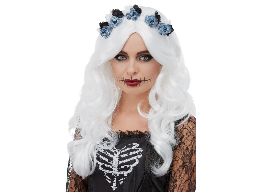 Nevšechní barva vlasů vždy okolí zaujme. Vykouzlete si nový účes pomocí bílé paruky s růžemi, naličte make-up kostlivce a vydejte se na párty ve stylu Den mrtvých nebo na Halloween.