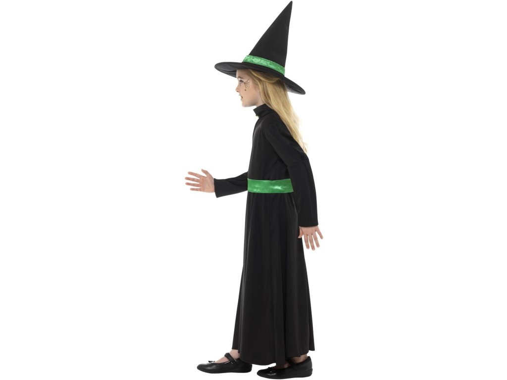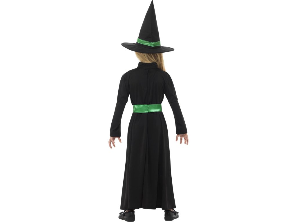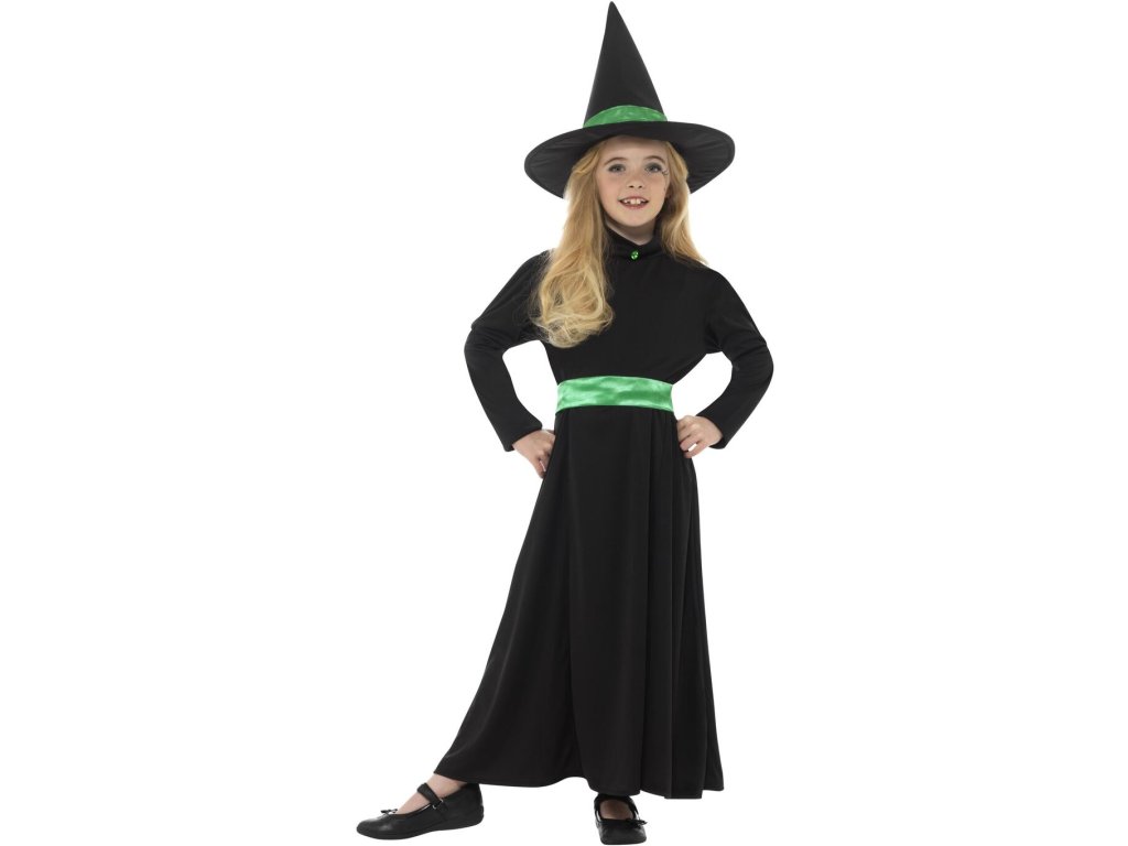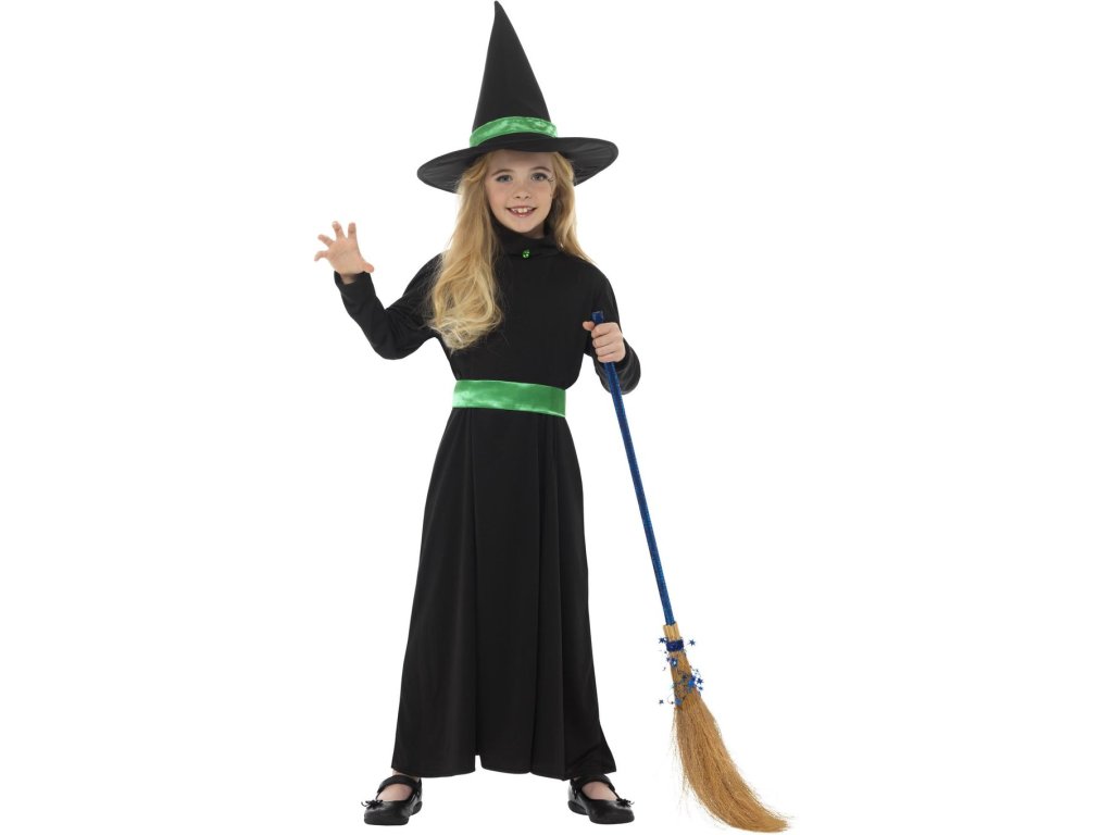 Dětský kostým čarodějky ocení každá malá slečna, který chce umět létat na koštěti a kouzlit. Dlouhé černé šaty se zeleným páskem a barevně sladěným špičatým kloboukem udělá radost každé dívce. Čarodějnický kostým využije jak při oslavách Halloweenu, tak u příležitosti pálení čarodějnic či na karnevalu.
