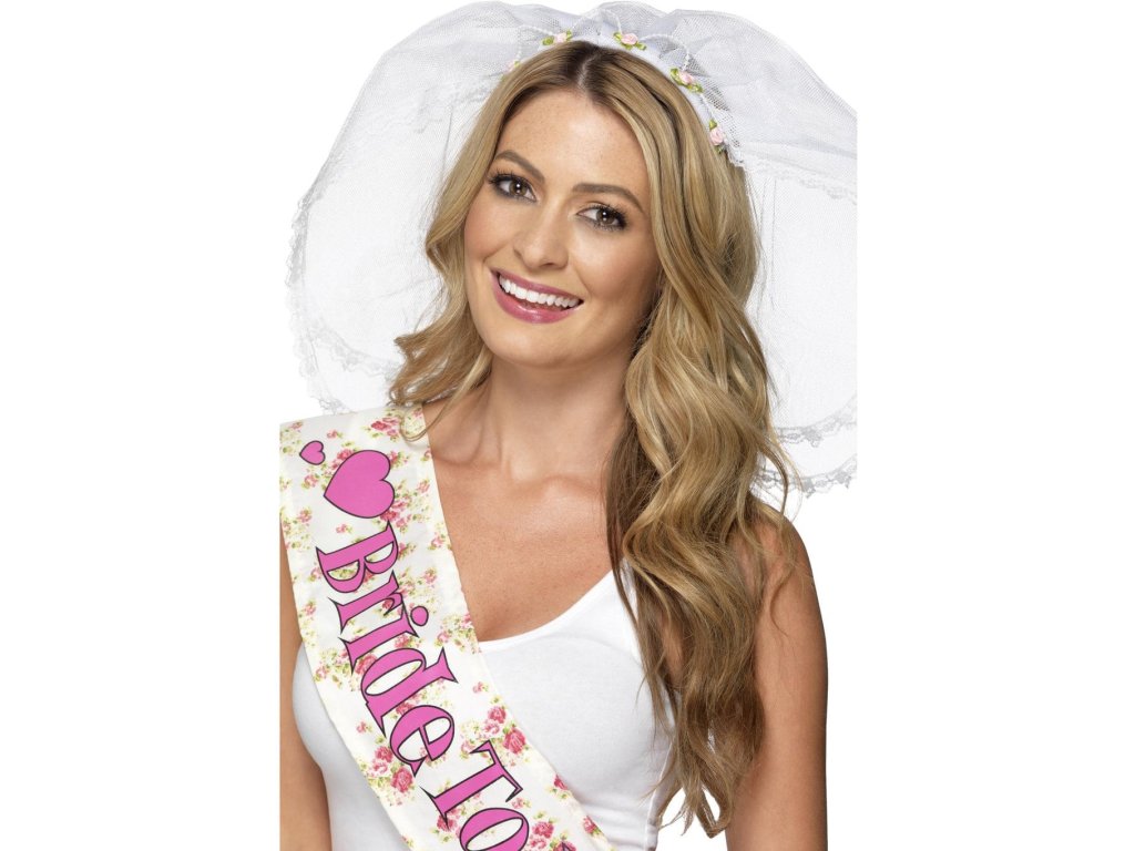 Bílý závoj pro budoucí nevěstu s perličkami na provázku a malými růžičkami. Oživte party dalšími bílými a růžovými doplňky a "nabídněte" nevěstě i hostům nezapomenutelný zážitek na rozlučce se svobodou.