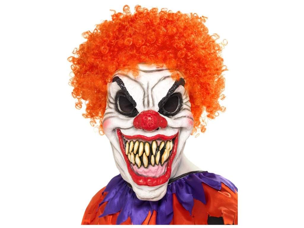 Klauni umí být nejen veselí, ale také děsiví. Celohlavová latexová maska děsivého klauna s červenou parukou bude na Halloweenské party rozhodně originální. Velké zuby v hrůzostrašném úsměvu naženou husí kůži i otrlým jedincům.