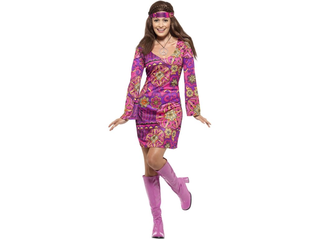 Dámské karnevalové hippie šaty se zvonovými rukávy se díky své barevnosti stanou tím nejhezčím kostýmem na hippies karnevalu. Můžete v nich také zazářit na jakékoliv retro party, například ve stylu filmu Rebelové.