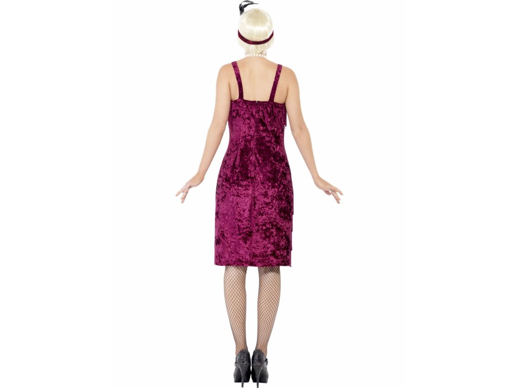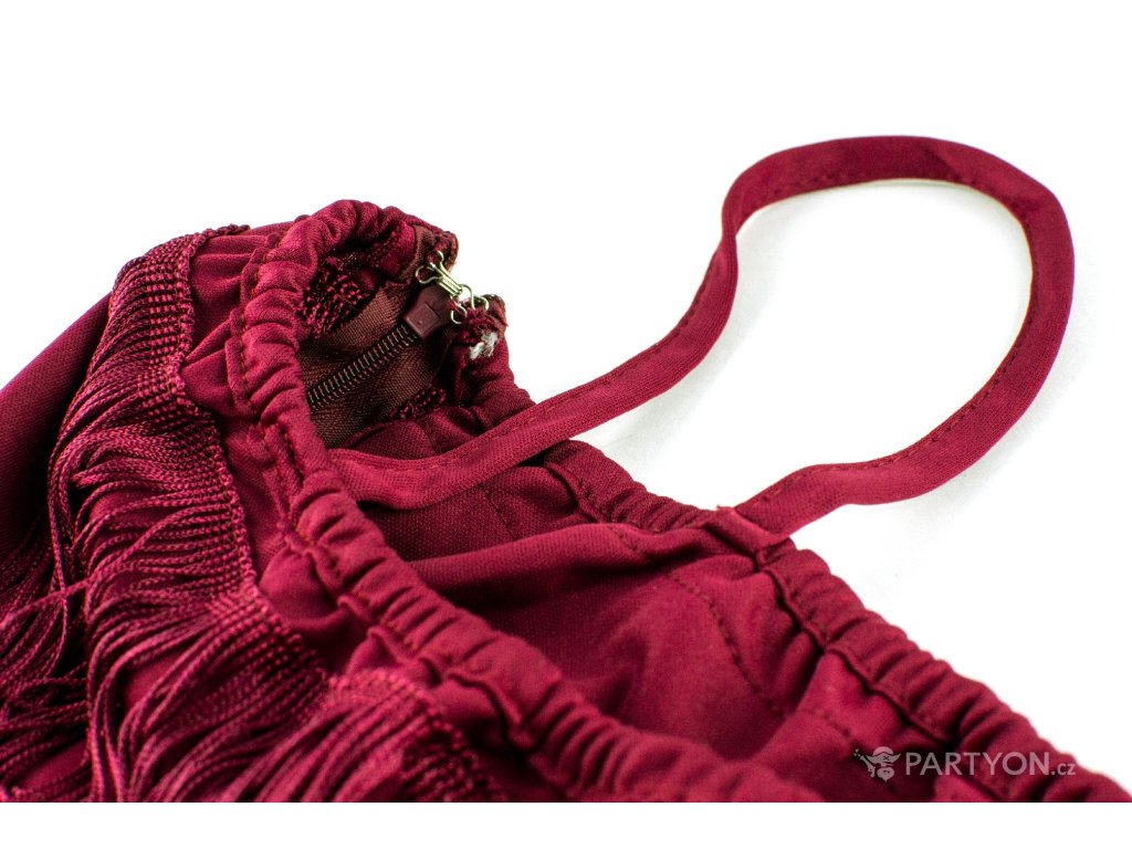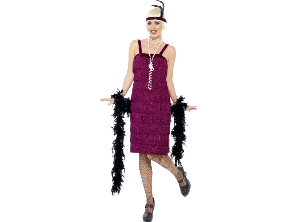 Dámský kostým Charleston v elegantní vínové barvě rozhodně zaujme na společenské akci ve stylu 30. let. Šaty zdobené třásněmi budou kopírovat vaše ladné pohyby. Ozdobou do vlasů je pak pro období mafiánů a jejich večírků typická čelenka s peřím.