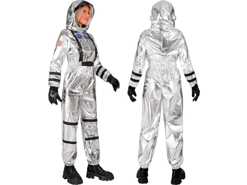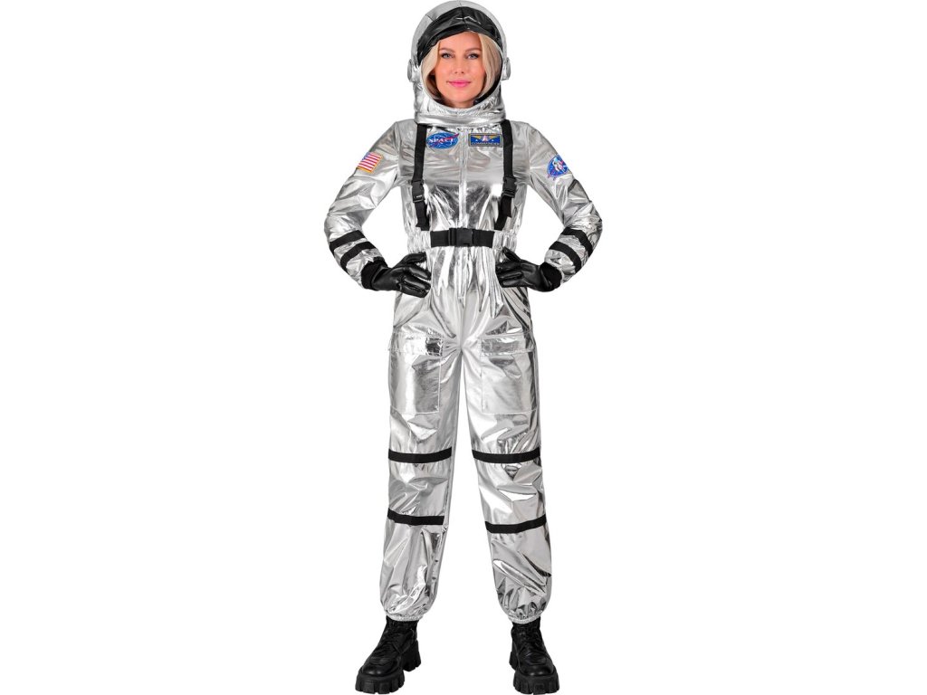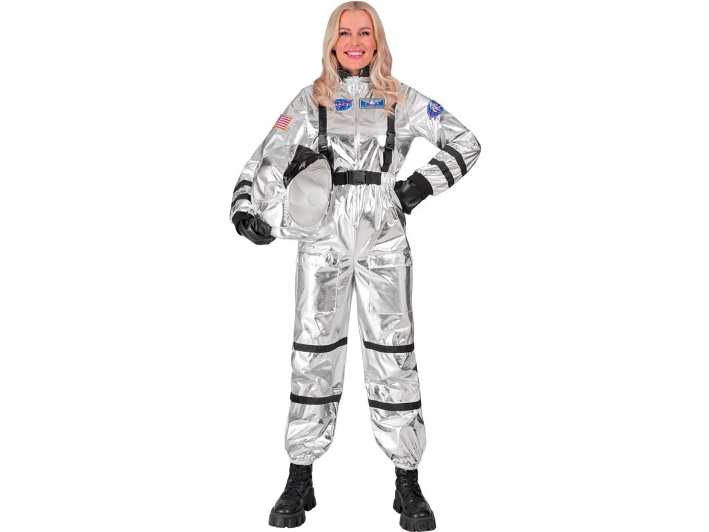Lesklý stříbrný kostým astronautky pro dospělé.