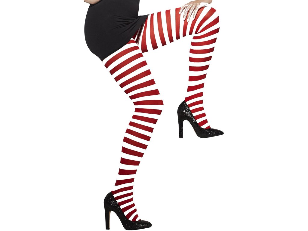 Punčocháče v bílé barvě s červenými horizontálními pruhy využijete k šatům na na Vánoční večírek, ale také k různým kostýmům na Halloween.