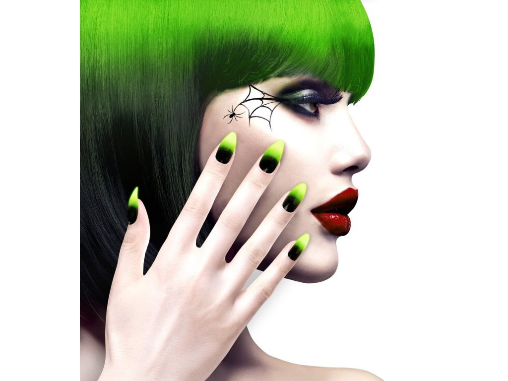 Jednou z věcí, které si okolí všimne, je vaše upravená manikura. Pokud vám ale nehty nerostou tak rychle, jak byste si představovala a nebo je zkrátka v běžném životě nerada nosíte, ale kostým si je žádá, jednoduše použijte umělé nalepovací nehty. Zelenočerné nehty využijete především ke kostýmu zombie, čarodějnice nebo k jakémukoliv jinému převleku na Halloween.