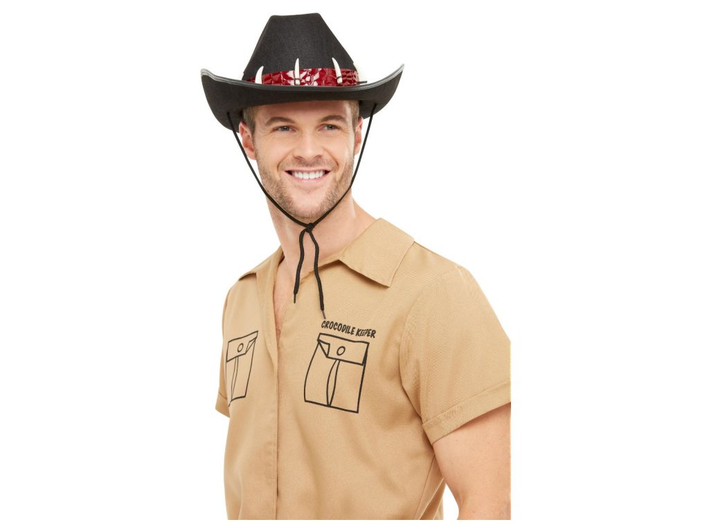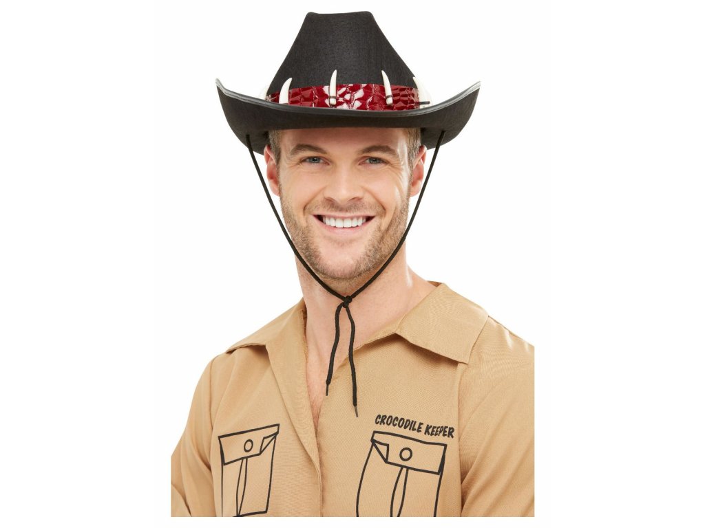 • klobouk ozdoben červenou koženkou a krokodýlími zuby
