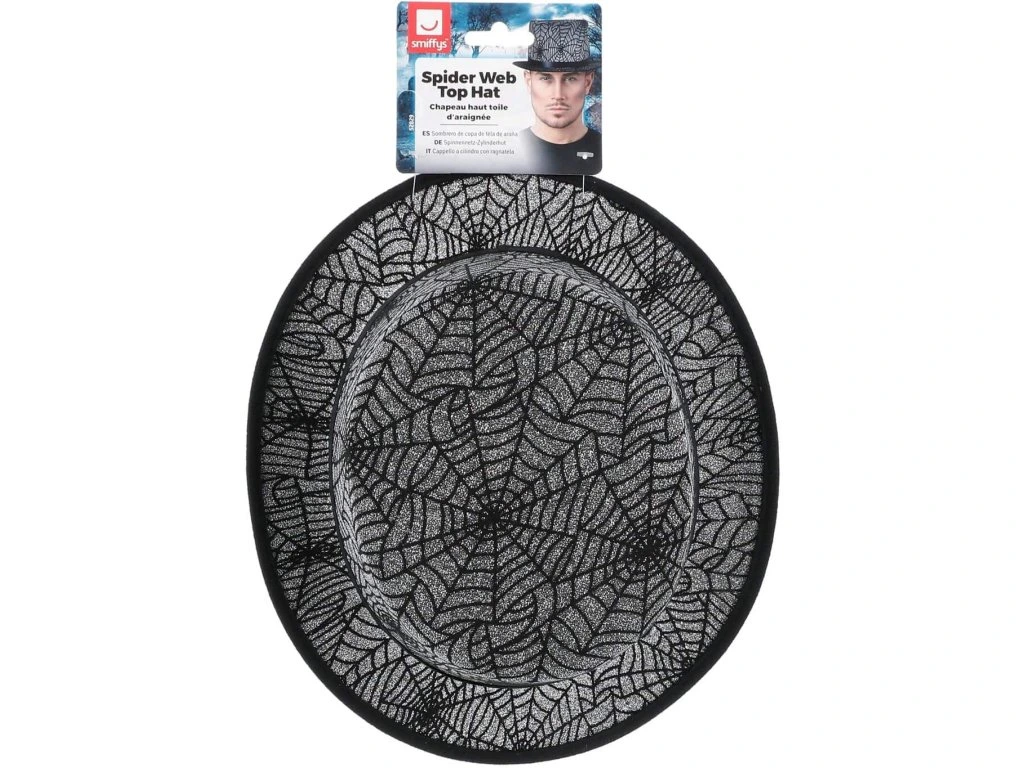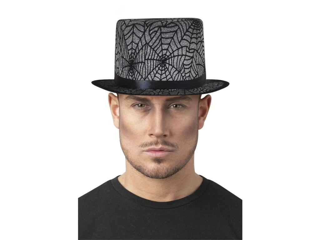 Slušivý cylindr zdobený pavučinou drží svůj tvar a poslouží jako skvělý doplněk k Halloweenskému kostýmu.