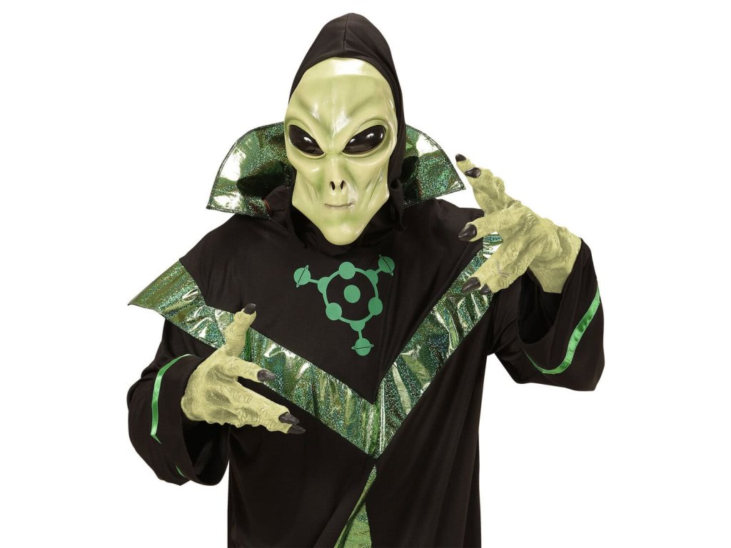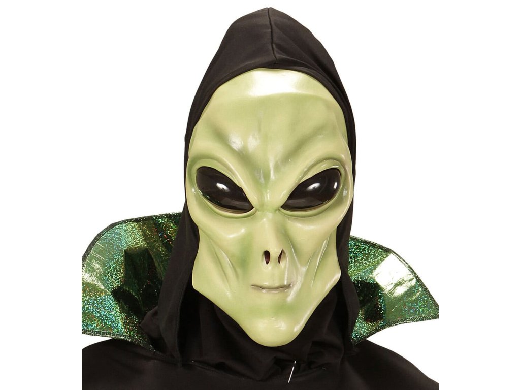 Zelená maska mimozemšťana s černým přehozem přes hlavu za vás jednoduše vyřeší převlek na Halloween. Pak už vám bude stačit vzít si na sebe například dlouhý černý plášť a vyrazit se pokusit komunikovat se smrtelníky.