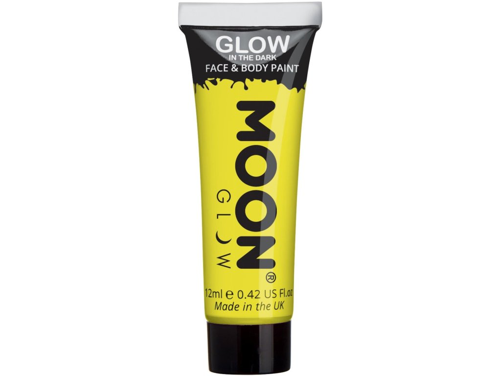 Fosforující sytě žlutá barva na tělo a obličej, která po nasvícení zdrojem světla ve tmě sama svítí.