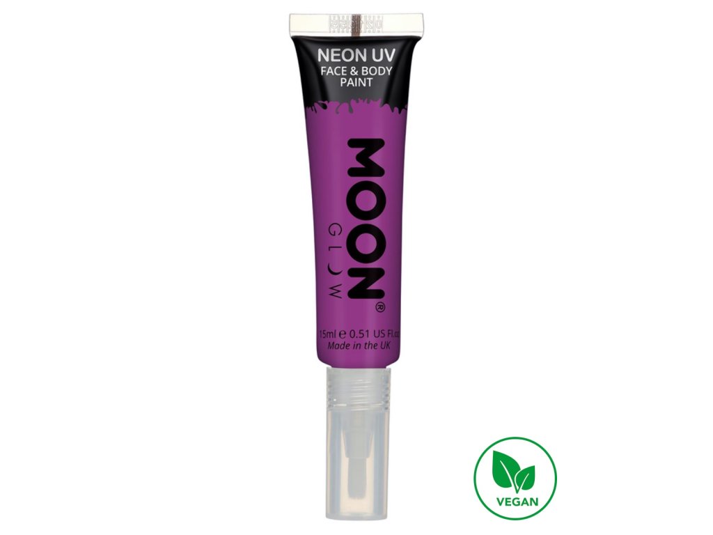 Neonově fialová UV barva na vodní bázi připravená k použití rovnou z tuby se štětečkovým aplikátorem.