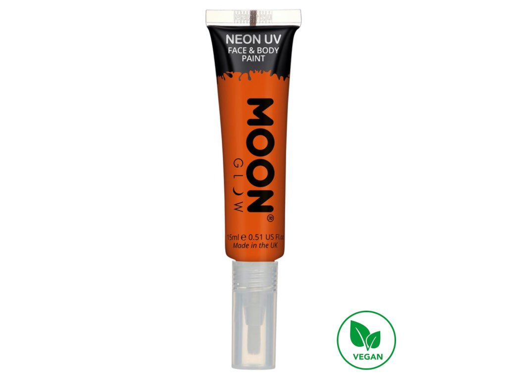 Neonově oranžová UV barva na vodní bázi připravená k použití rovnou z tuby se štětečkovým aplikátorem.
