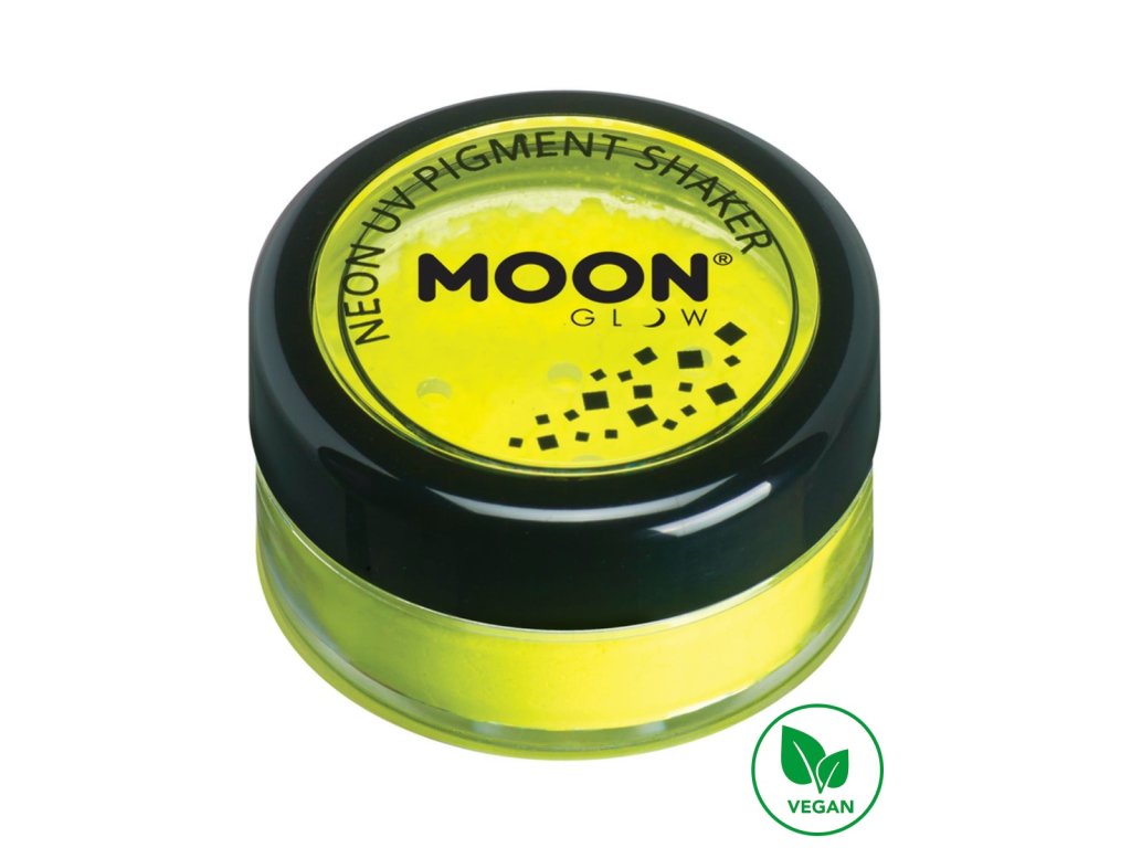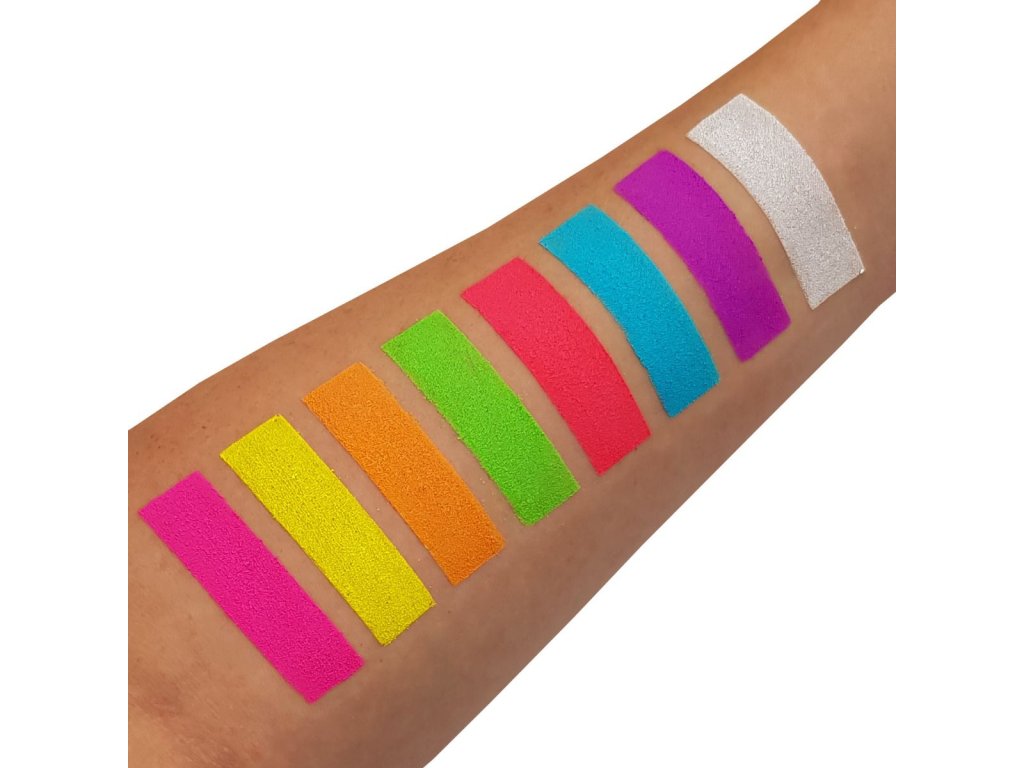 Vytvořte zářivě neonové UV efekty pomocí jemně třpytivého žlutého pigmentového prášku na tělo, který se pod UV světlem rozzáří.