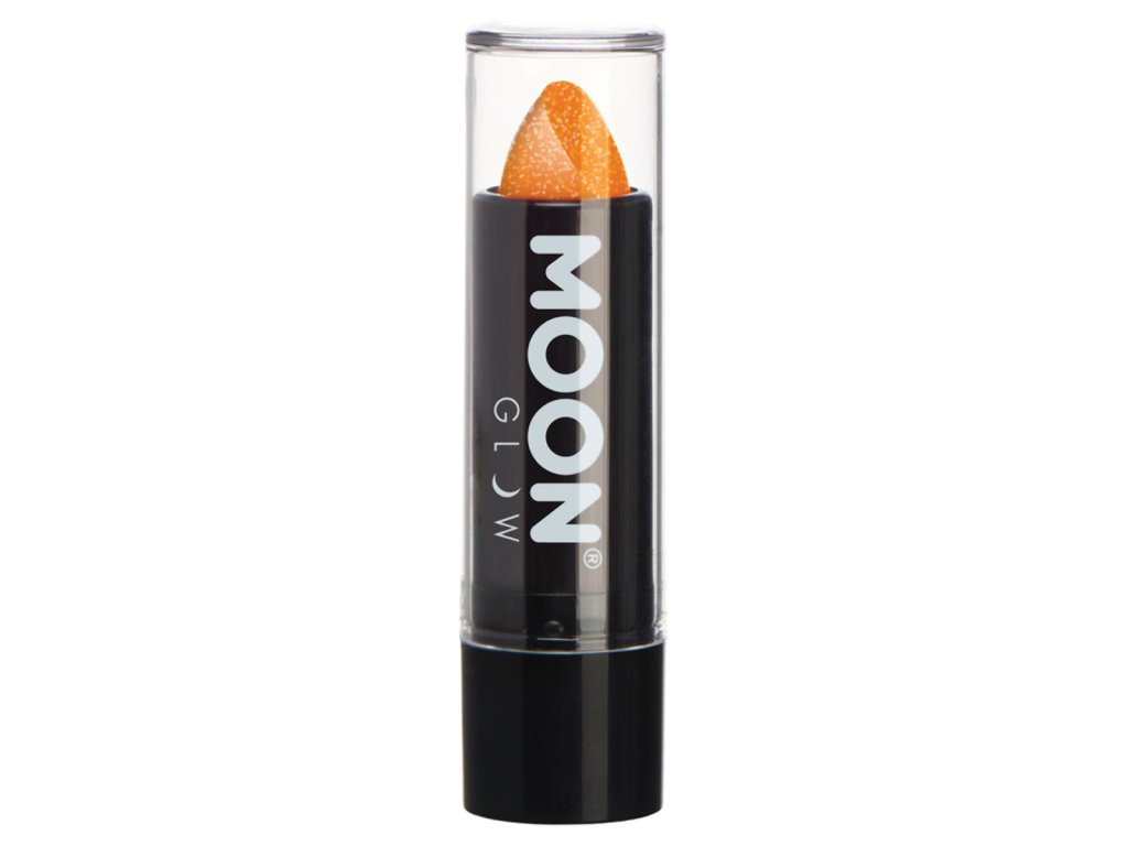 Sytě neonově oranžová třpytivá rtěnka, která se pod UV světlem doslova rozzáří.