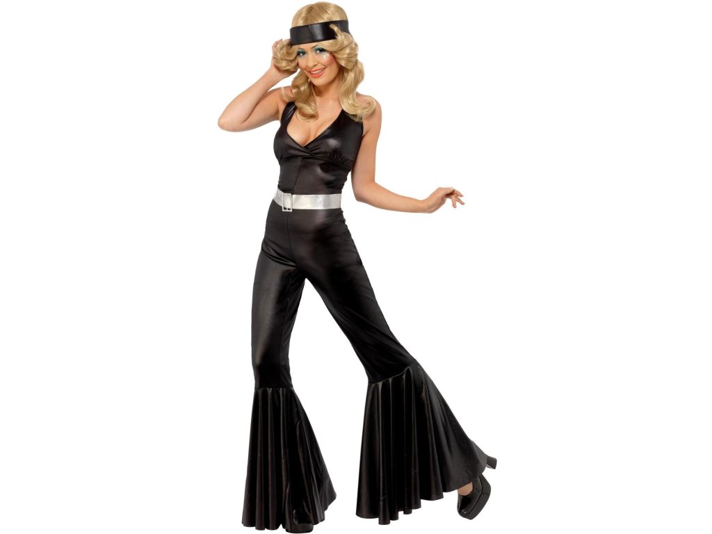 Tento černý kostým, který zahrnuje přiléhavý stylový šátek na hlavu a výrazný pásek, dokonale ztělesňuje kouzlo a energii 70. let.