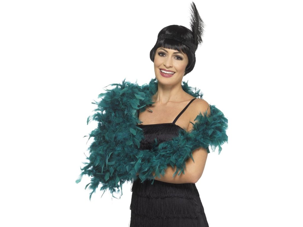 Elegantní tyrkysové péřové boa je nezbytným doplňkem dámských kostýmů z 30. let. Díky boa jednoduše oživíte i obyčejné šaty. Péřové boa využijete nejen na večírky ve stylu 30. let, ale i na silvestrovské party, večírky inspirované Hollywoodem, rozlučku se svobodou a další příležitosti.