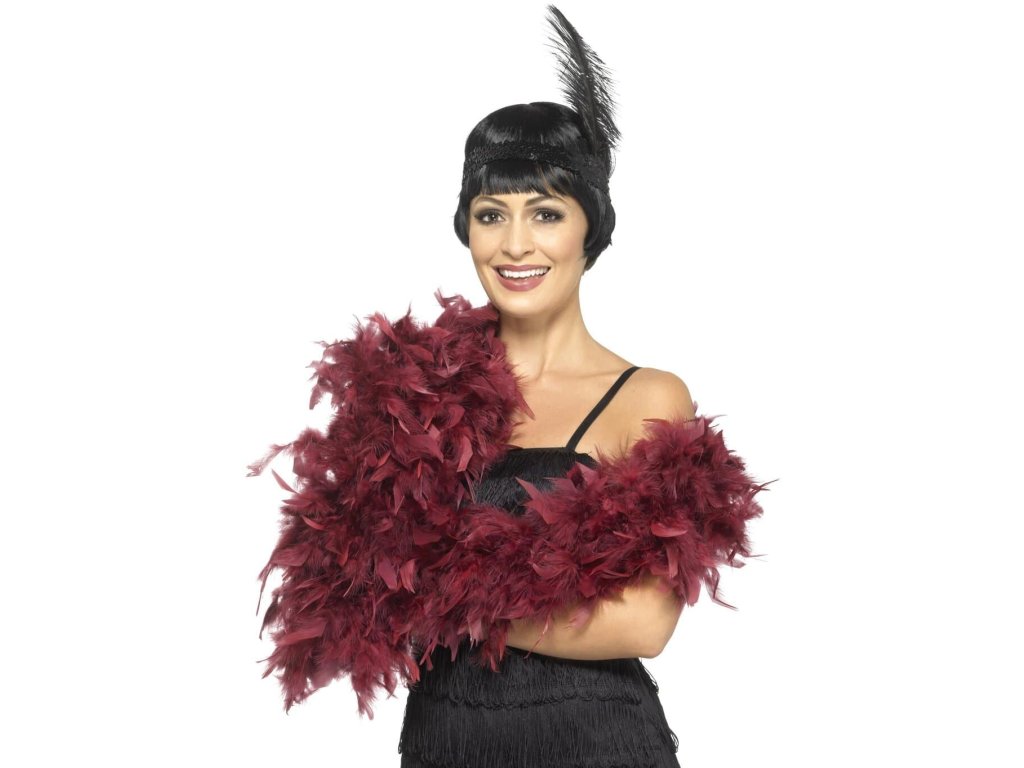 Elegantní vínové péřové boa je nezbytným doplňkem dámských kostýmů z 30. let. Díky boa jednoduše oživíte i obyčejné šaty. Péřové boa využijete nejen na večírky ve stylu 30. let, ale i na silvestrovské party, večírky inspirované Hollywoodem, rozlučku se svobodou a další příležitosti.