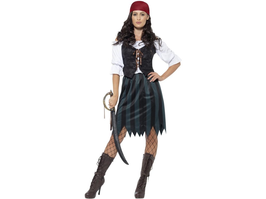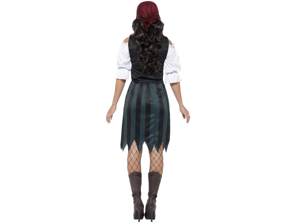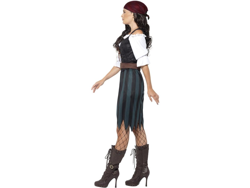 Dámský kostým pirátky s pruhovanými šaty je přesně jako dělaný na pirátskou párty. Na palubě rozhodně nebyli vždy jen muži, ale i ženy znalé moře si umí sjednat pořádek. Popadněte pirátskou vlajku a dejte všem jasně najevo, která posádka tu vládne.