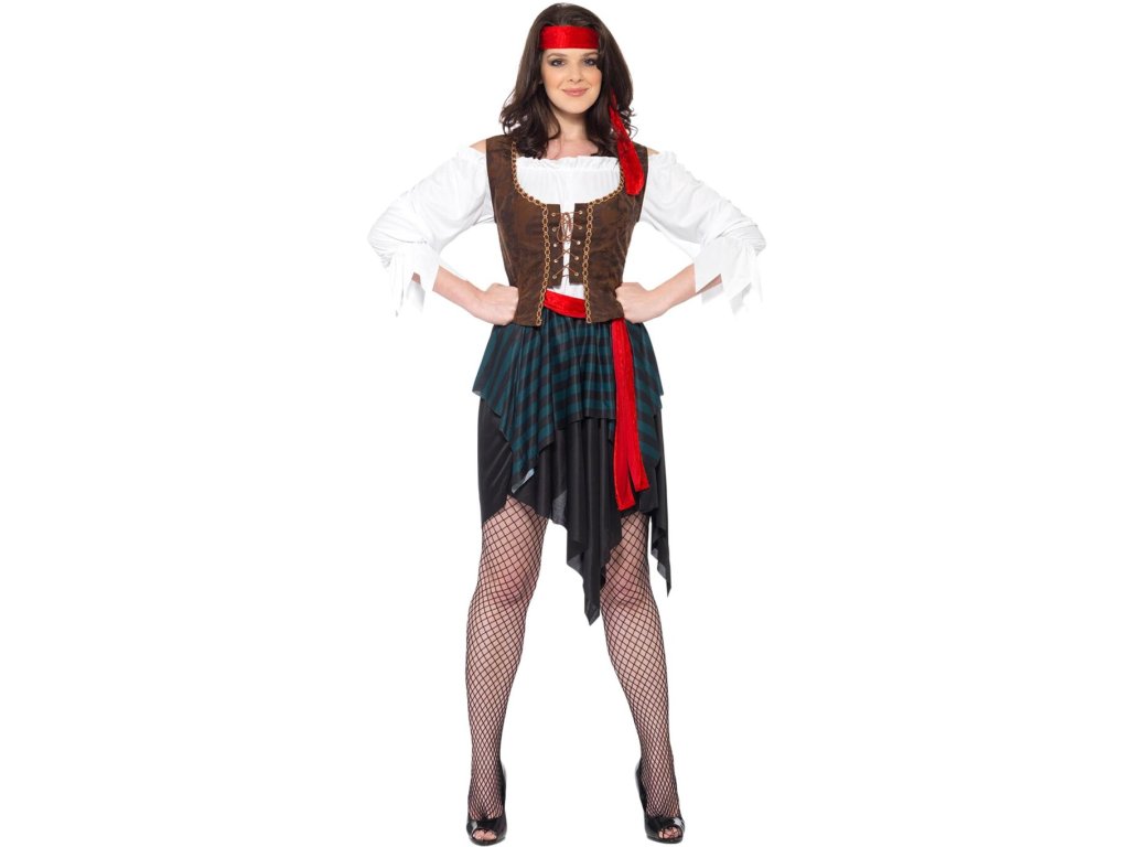 I piráti mají svou lady. Přesvědčte se sami. Dámský kostým pirátské lady lichotí postavě. Oblíbený karnevalový kostým obsahuje vestu se všitou bílou halenkou, pruhovanou sukni, pásek a šátek na hlavu. Co byste totiž byli za pirátku bez šátku! Kostým je vhodný na karnevaly, pirátskou party v kostýmech nebo poslední zvonění.