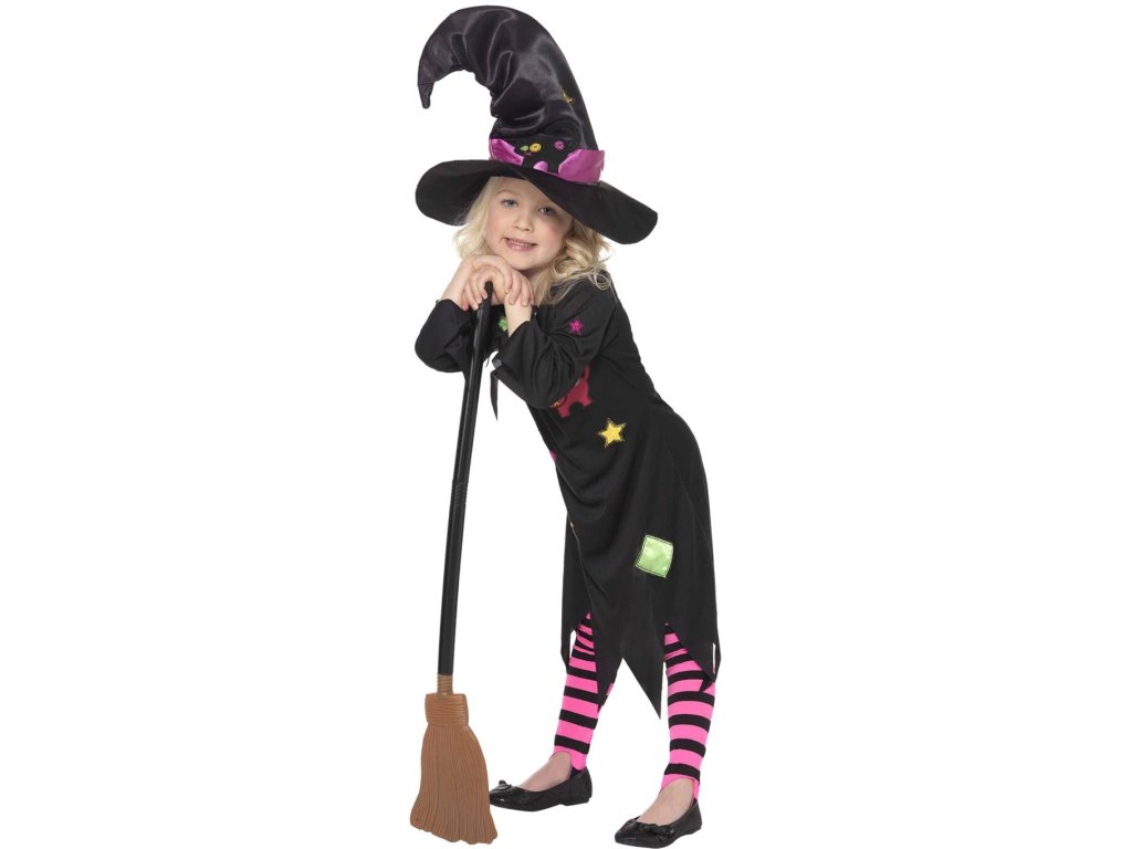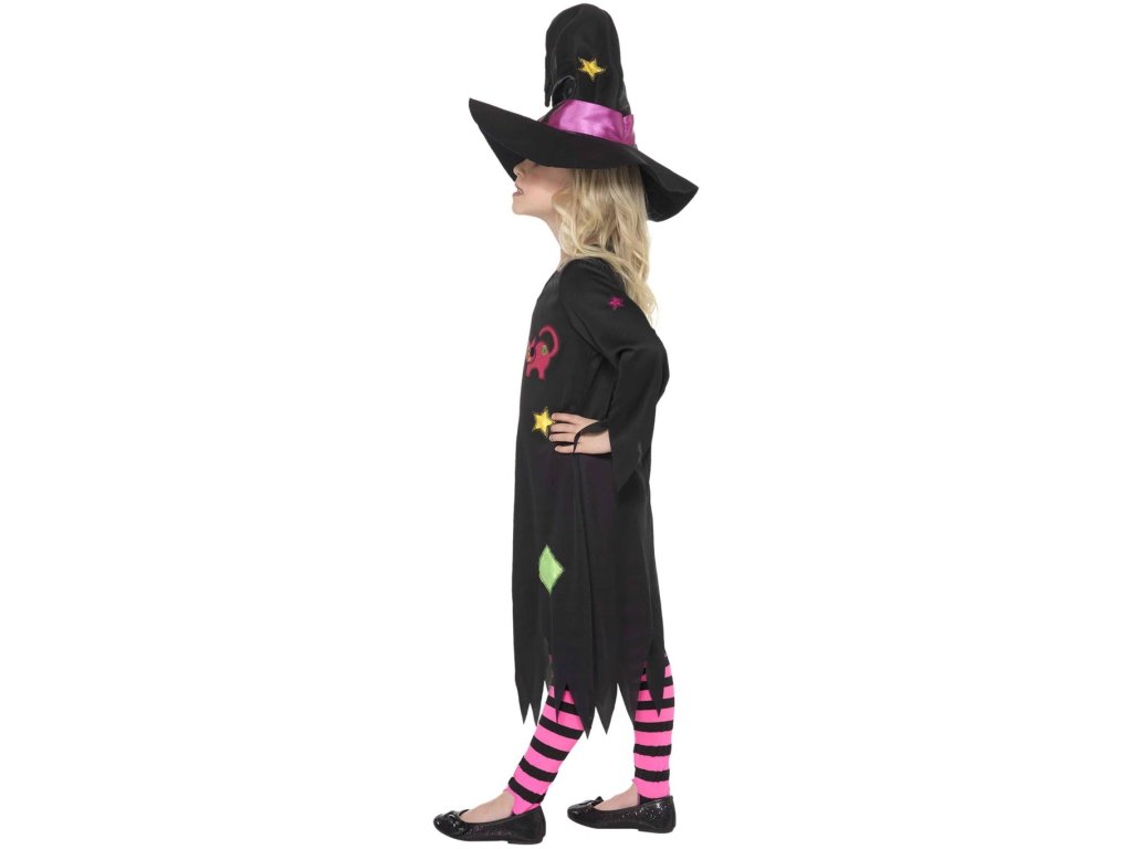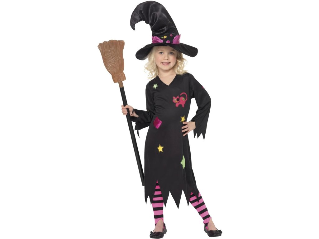 Dětský kostým pro učenlivé čarodějky ocení každá malá slečna, který chce umět létat na koštěti. Střapaté černé šaty s barevnými tvary, hvězdičkami a kočkou a barevně sladěný špičatý klobouk udělá radost každé dívce. Čarodějnický kostým využije při oslavách Halloweenu, tak u příležitosti pálení čarodějnic či na karnevalu.