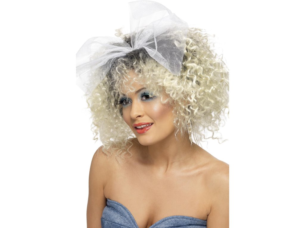 Pokud se chystáte na retro party ve stylu 80. let, nezapomeňte na pořádně divoký účes. Nemusíte ale na trvalou, stačí si nasadit dámskou kudrnatou paruku. Paruka je zdobená bílou mašlí a sklidíte v ní zasloužený úspěch.