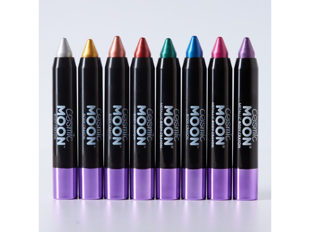 Vytvořte ohromující metalické vzory na obličeji i těle snadno a rychle pomocí fialové třpytivé metalické tužky.