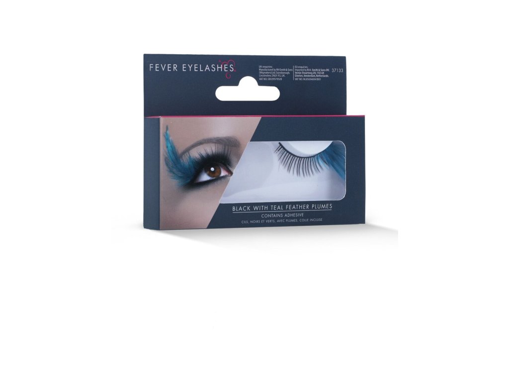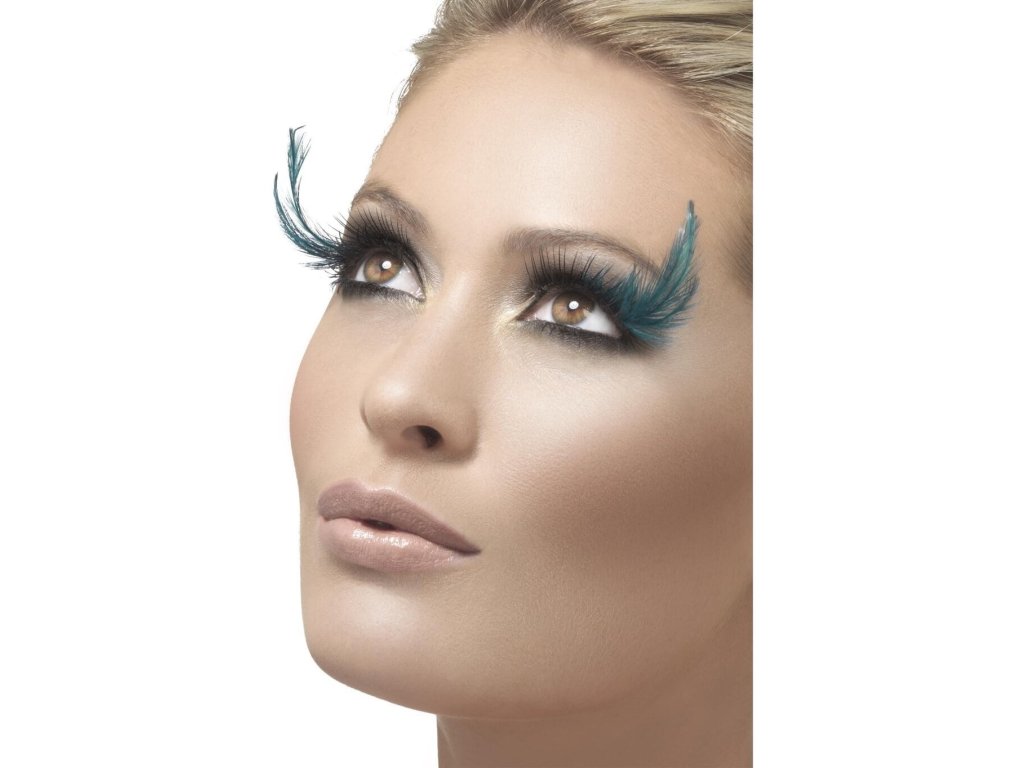Extravagantní nalepovací řasy s modrozelenými peříčky k doladění jakéhokoli kostýmu (fantasy, halloween) nebo na módní fashion focení, přehlídky a party.