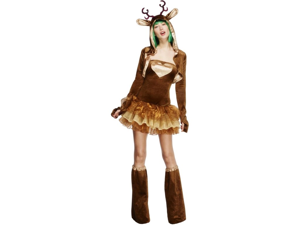 KOSTÝM OBSAHUJE: šaty s tutu sukní a odnímatelnými průhlednými ramínky, bolerko s kapucí zdobenou ušima a parůžky, návleky na boty